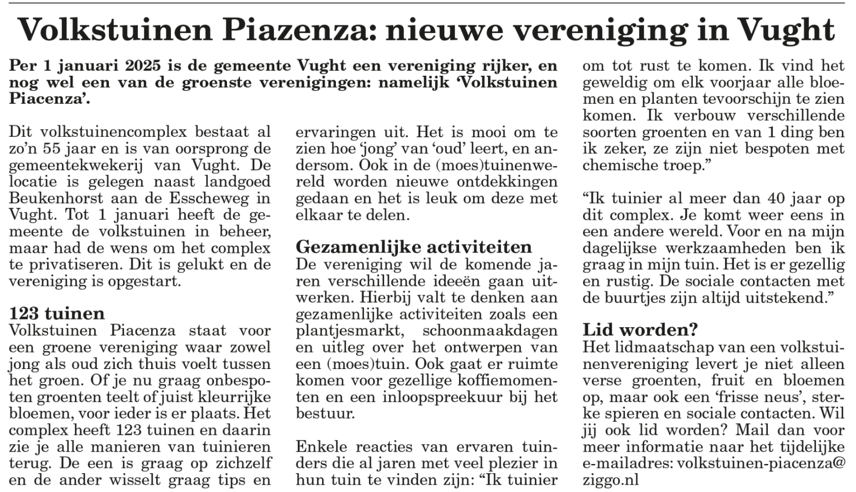 Met trots kondigt Volkstuin Piacenza aan dat de gemeente Vught per 1 januari 2025 een nieuwe vereniging rijker is. Deze groene vereniging, geworteld in de historie van Vught, biedt ruimte aan jong en oud om samen te genieten van tuinieren en alles wat groen te bieden heeft.